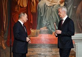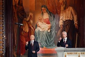 Праздничное Пасхальное богослужение в кафедральном соборном храме Христа Спасителя. Президент России Владимир Путин (слева) и мэр Москвы Сергей Собянин (справа) во время богослужения.