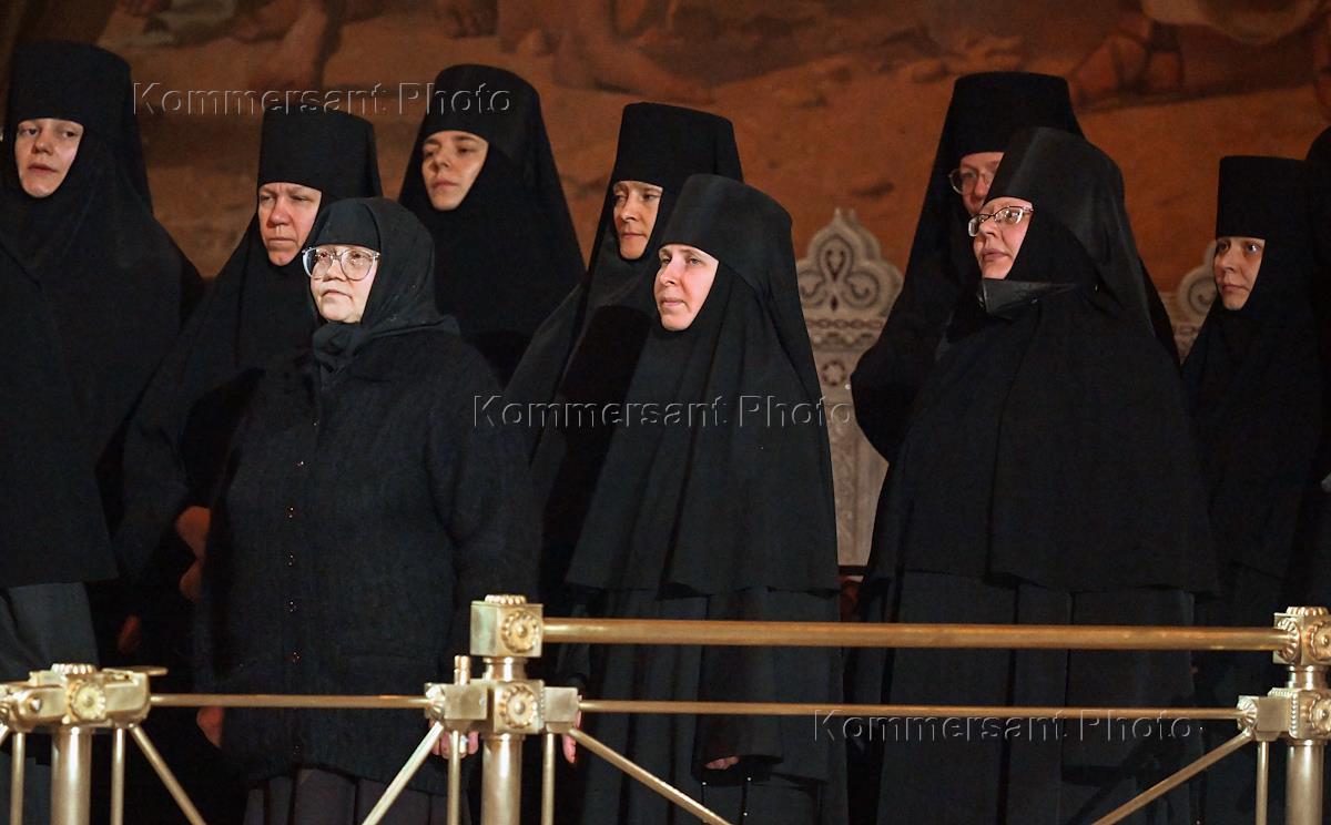 Праздничное Пасхальное богослужение в кафедральном соборном храме Христа Спасителя. Монахини во время богослужения.