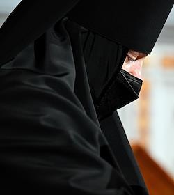 Праздничное Пасхальное богослужение в кафедральном соборном храме Христа Спасителя. Жанровая фотография. Монахиня во время богослужения.