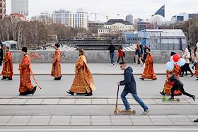 Праздничный пасхальный крестный ход от Свято-Троицкого собора до Храма-на-Крови. Митрополит Екатеринбургский и Верхотурский Евгений (в центре) во время крестного хода.