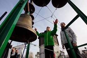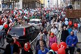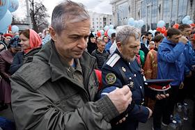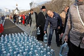 Праздничный пасхальный крестный ход от Свято-Троицкого собора до Храма-на-Крови. Участники крестного хода во время сбора воды и гуманитарной помощи для жителей Донбасса.