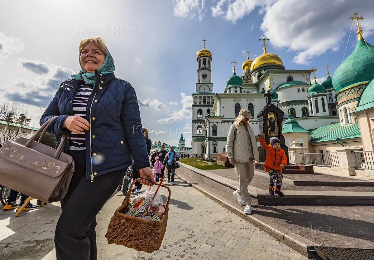 Великая Суббота. Чин освящения пасхальных куличей, яиц и пасхи в канун Светлого Христова Воскресения в Воскресенском Ново-Иерусалимском монастыре. Жанровая фотография.