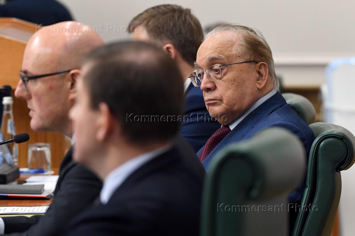Meeting of the Council for the Development of the Digital Economy on the topic "Scientific and educational policy and training in the era of the digital economy" in the Federation Council of Russia. Chairman of the Russian State Duma Committee on Information Policy, Information Technologies and Communications Alexander Khinshtein (right) during a meeting.