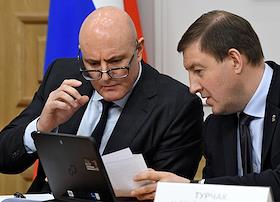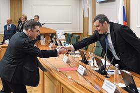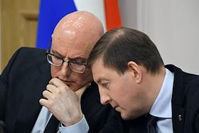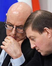 Meeting of the Council for the Development of the Digital Economy on the topic "Scientific and educational policy and training in the era of the digital economy" in the Federation Council of Russia. Deputy Prime Minister of Russia Dmitry Chernyshenko (left) and First Deputy Chairman of the Federation Council, Chairman of the Council for the Development of the Digital Economy Andrey Turchak (right) during the meeting.