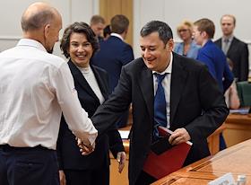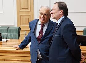 Meeting of the Council for the Development of the Digital Economy on the topic "Scientific and educational policy and training in the era of the digital economy" in the Federation Council of Russia. Lomonosov Moscow State University rector Viktor Sadovnichy (left) and Russian Deputy Minister of Science and Higher Education Dmitry Afanasyev (right) before the meeting.