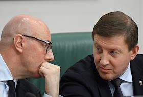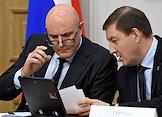 Meeting of the Council for the Development of the Digital Economy on the topic "Scientific and educational policy and training in the era of the digital economy" in the Federation Council of Russia. Chairman of the Russian State Duma Committee on Information Policy, Information Technologies and Communications Alexander Khinshtein (right) and manager of the Informatization Coordination Department of the Russian Ministry of Telecom and Mass Communications Nikolai Yatselenko (left) before the meeting.