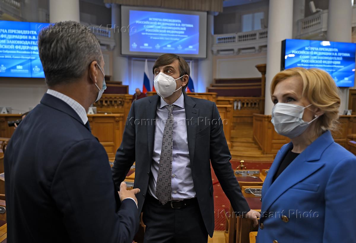 Заседание Совета законодателей России при Федеральном Собрании России, посвященное Дню российского парламентаризма, в Таврическом дворце. Слева направо: первый заместитель председателя Совета Федерации России Андрей Яцкин, министр просвещения России Сергей Кравцов и заместитель председателя Государственной думы России Ирина Яровая перед началом заседания.