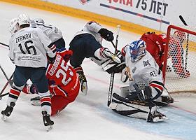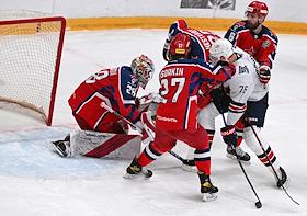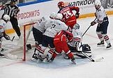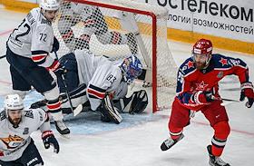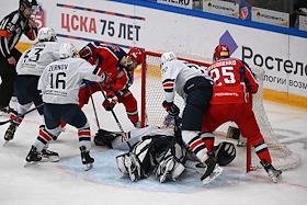 Континентальная хоккейная лига (КХЛ). Плей-офф. Финал Чемпионата. 6-й матч. Матч между командами ЦСКА (Москва) -"Металлург Мг" (Магнитогорск) на стадионе "ЦСКА-Арена". Справа налево: вратарь команды ЦСКА Иван Федотов, игрок команды "Металлург Мг" Филипп Майе, игроки команды ЦСКА Владислав Каменев и Никита Нестеров во время матча.