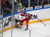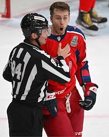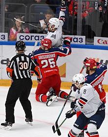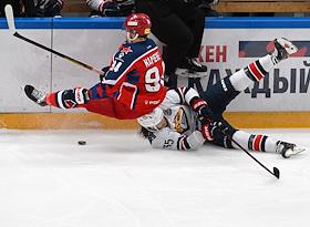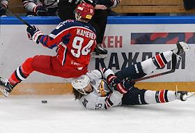 Континентальная хоккейная лига (КХЛ). Плей-офф. Финал Чемпионата. 6-й матч. Матч между командами ЦСКА (Москва) -"Металлург Мг" (Магнитогорск) на стадионе "ЦСКА-Арена". Игрок команды "Металлург Мг" Артем Земчёнок (слева) во время матча.