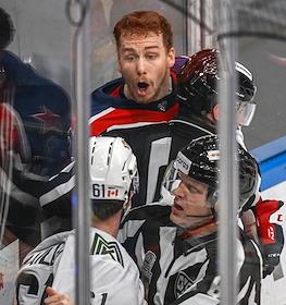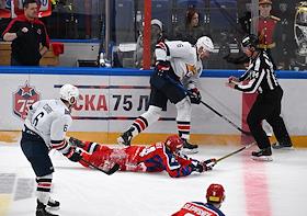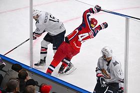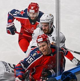 Континентальная хоккейная лига (КХЛ). Плей-офф. Финал Чемпионата. 6-й матч. Матч между командами ЦСКА (Москва) -"Металлург Мг" (Магнитогорск) на стадионе "ЦСКА-Арена". Игрок команды ЦСКА Владислав Провольнев (в центре) во время матча.