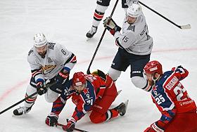 Континентальная хоккейная лига (КХЛ). Плей-офф. Финал Чемпионата. 6-й матч. Матч между командами ЦСКА (Москва) -"Металлург Мг" (Магнитогорск) на стадионе "ЦСКА-Арена". Игрок команды "Металлург Мг" Артем Земчёнок (второй слева) и игрок команды ЦСКА Константин Окулов (в центре) во время матча.