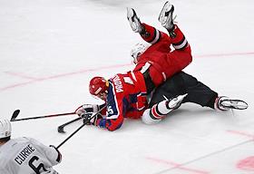 Континентальная хоккейная лига (КХЛ). Плей-офф. Финал Чемпионата. 6-й матч. Матч между командами ЦСКА (Москва) -"Металлург Мг" (Магнитогорск) на стадионе "ЦСКА-Арена". Игрок команды ЦСКА Павел Карнаухов (слева) во время матча.