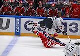 Континентальная хоккейная лига (КХЛ). Плей-офф. Финал Чемпионата. 6-й матч. Матч между командами ЦСКА (Москва) -"Металлург Мг" (Магнитогорск) на стадионе "ЦСКА-Арена". Игрок команды ЦСКА Данил Юртайкин (слева) и игрок команды "Металлург Мг" Филипп Майе (справа) во время матча.