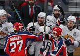 Континентальная хоккейная лига (КХЛ). Плей-офф. Финал Чемпионата. 6-й матч. Матч между командами ЦСКА (Москва) -"Металлург Мг" (Магнитогорск) на стадионе "ЦСКА-Арена". Главный тренер команды "Металлург Мг" Илья Воробьев (второй справа) во время матча.