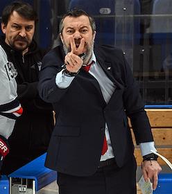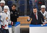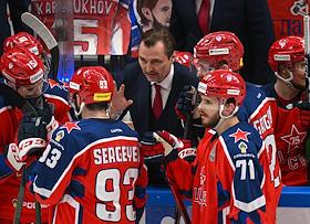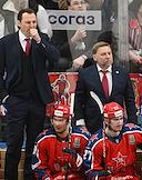 Континентальная хоккейная лига (КХЛ). Плей-офф. Финал Чемпионата. 6-й матч. Матч между командами ЦСКА (Москва) -"Металлург Мг" (Магнитогорск) на стадионе "ЦСКА-Арена". Главный тренер ЦСКА Сергей Федоров (слева) во время матча.