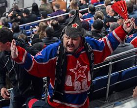 Континентальная хоккейная лига (КХЛ). Плей-офф. Финал Чемпионата. 6-й матч. Матч между командами ЦСКА (Москва) -"Металлург Мг" (Магнитогорск) на стадионе "ЦСКА-Арена". Болельщик команды ЦСКА на трибуне во время матча.