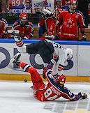 Континентальная хоккейная лига (КХЛ). Плей-офф. Финал Чемпионата. 6-й матч. Матч между командами ЦСКА (Москва) -"Металлург Мг" (Магнитогорск) на стадионе "ЦСКА-Арена". Игрок команды "Металлург" Николай Голдобин (слева) и игрок команды ЦСКА Даррен Диц (справа) во время матча.