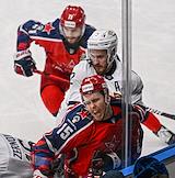Континентальная хоккейная лига (КХЛ). Плей-офф. Финал Чемпионата. 6-й матч. Матч между командами ЦСКА (Москва) -"Металлург Мг" (Магнитогорск) на стадионе "ЦСКА-Арена". Слева направо: игрок команды "Металлург" Филипп Майе, игрок команды ЦСКА Никита Нестеров и вратарь команды ЦСКА Иван Федотов во время матча.