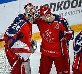 Континентальная хоккейная лига (КХЛ). Плей-офф. Финал Чемпионата. 6-й матч. Матч между командами ЦСКА (Москва) -"Металлург Мг" (Магнитогорск) на стадионе "ЦСКА-Арена". Вратарь команды ЦСКА Иван Федотов (слева) и игрок команды ЦСКА Владислав Провольнев (справа) во время матча.