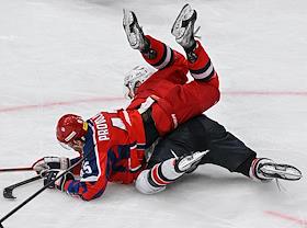 Континентальная хоккейная лига (КХЛ). Плей-офф. Финал Чемпионата. 6-й матч. Матч между командами ЦСКА (Москва) -"Металлург Мг" (Магнитогорск) на стадионе "ЦСКА-Арена". Игрок команды ЦСКА Антон Слепышев (слева) и игрок команды "Металлург Мг" Артем Земчёнок (справа) во время матча.