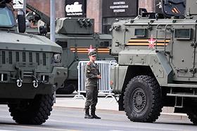 Репетиция Военного парада, посвященного 77-й годовщине Победы в Великой Отечественной войне. Проход военной техники по Тверской улице.