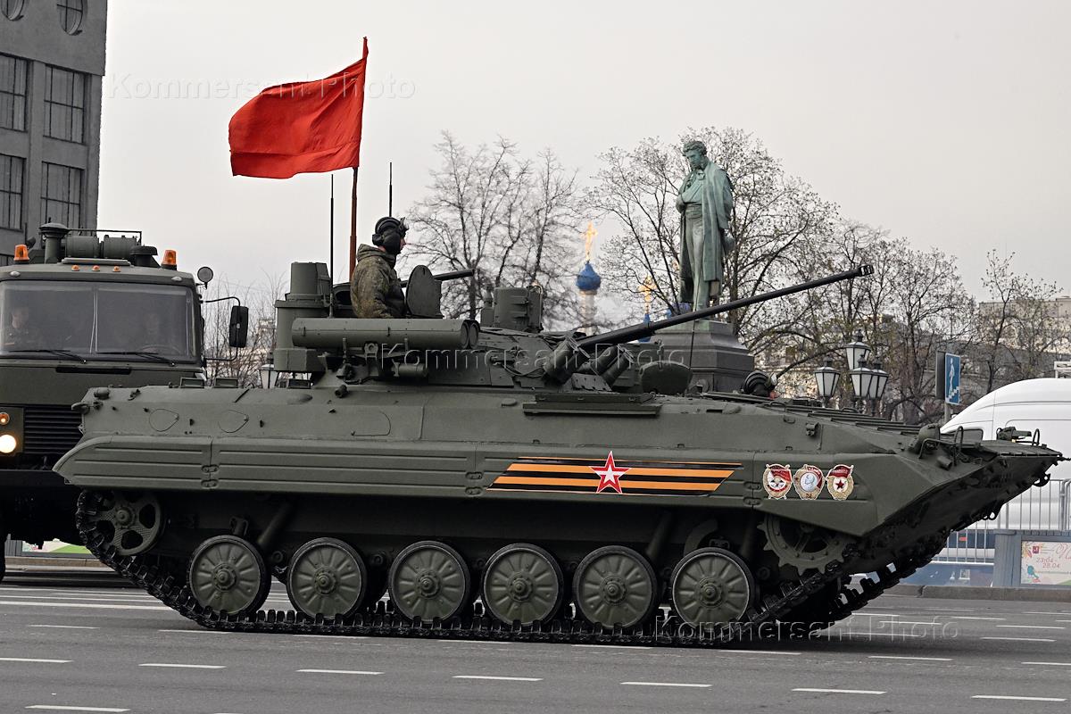 Репетиция Военного парада, посвященного 77-й годовщине Победы в Великой Отечественной войне, на Красной площади. Боевая машина пехоты БМП-2М во время прохода военной техники по Тверской улице.