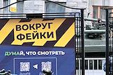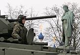 Репетиция Военного парада, посвященного 77-й годовщине Победы в Великой Отечественной войне, на Красной площади. Жанровая фотография. Плакат на фоне прохода военной техники по Тверской улице.