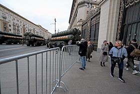 Репетиция Военного парада, посвященного 77-й годовщине Победы в Великой Отечественной войне, на Красной площади. Пусковая установка зенитного ракетного комплекса С-400 "Триумф" во время прохода военной техники по Тверской улице.