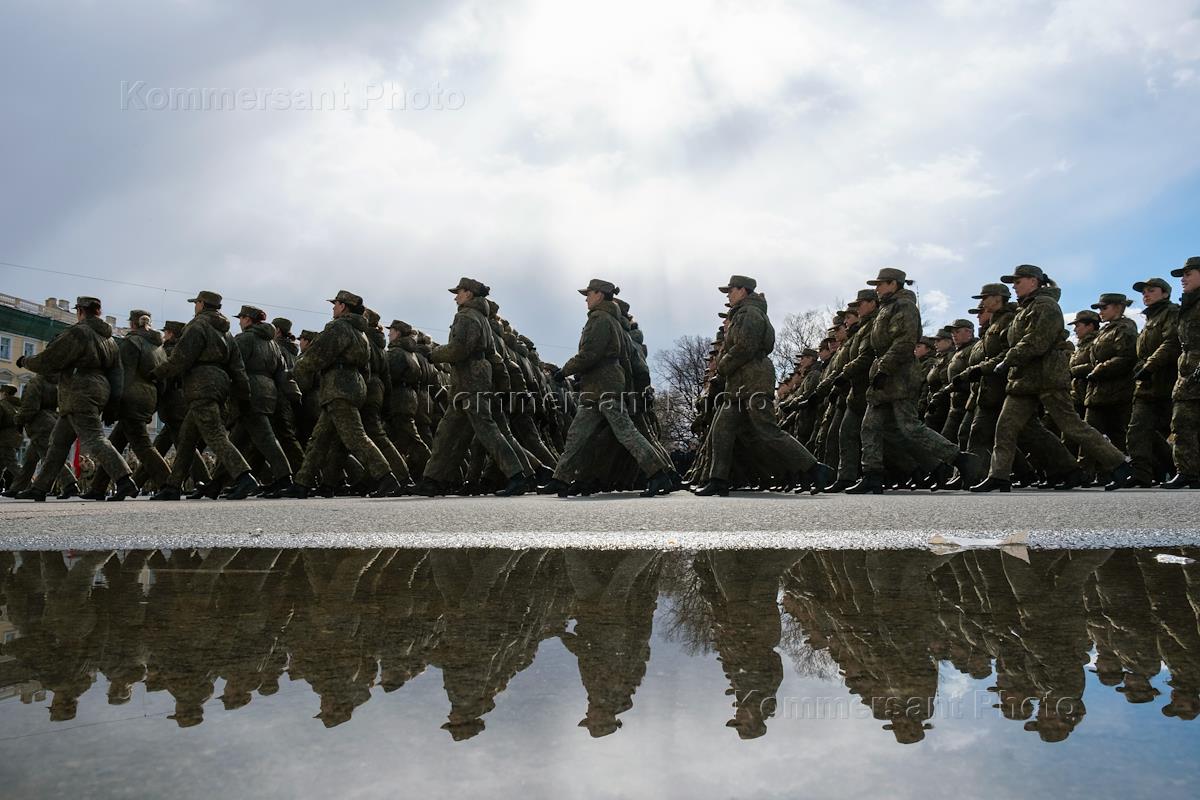 Репетиция Военного парада, посвященного 77-й годовщине Победы в Великой Отечественной войне, на Дворцовой площади. Военнослужащие во время репетиции.