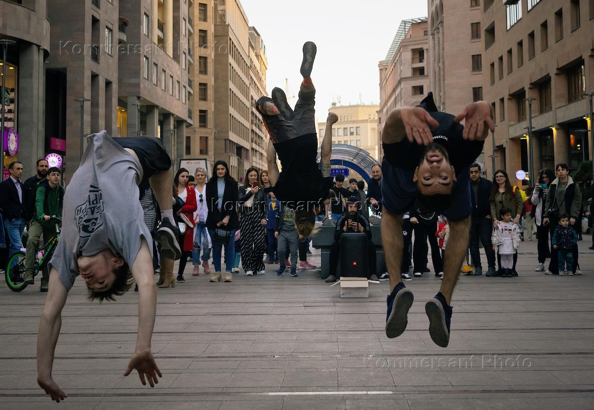 Views of Yerevan. Genre photography. Young people are dancing in the street.