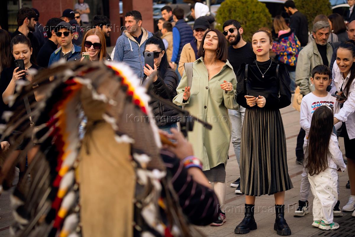 Views of Yerevan. Street musicians in national costumes, indigenous people of America - Indians, during a performance in the city square.
