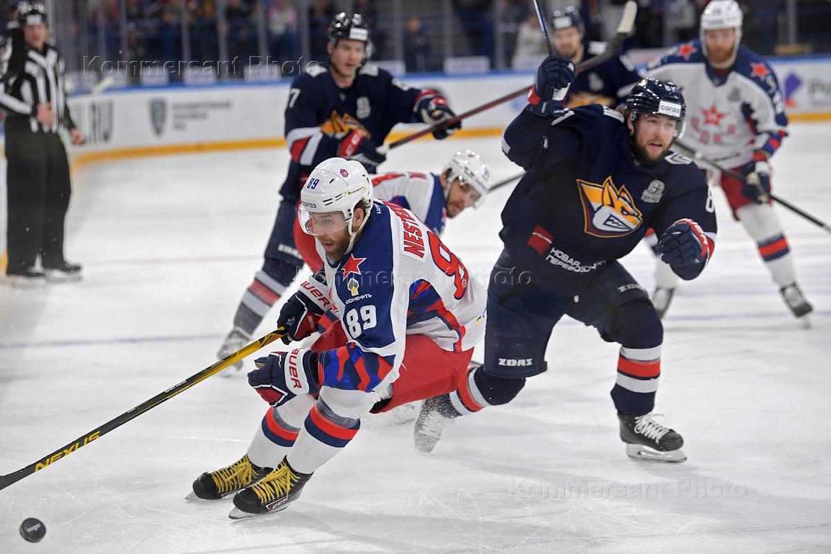 Континентальная хоккейная лига (КХЛ). Плей-офф Кубка Гагарина. Финал. 7-й матч. Матч между командами "Металлург Мг" (Магнитогорск) - ЦСКА (Москва) на стадионе "Арена-Металлург". Игрок команды ЦСКА Никита Нестеров (слева) во время матча.