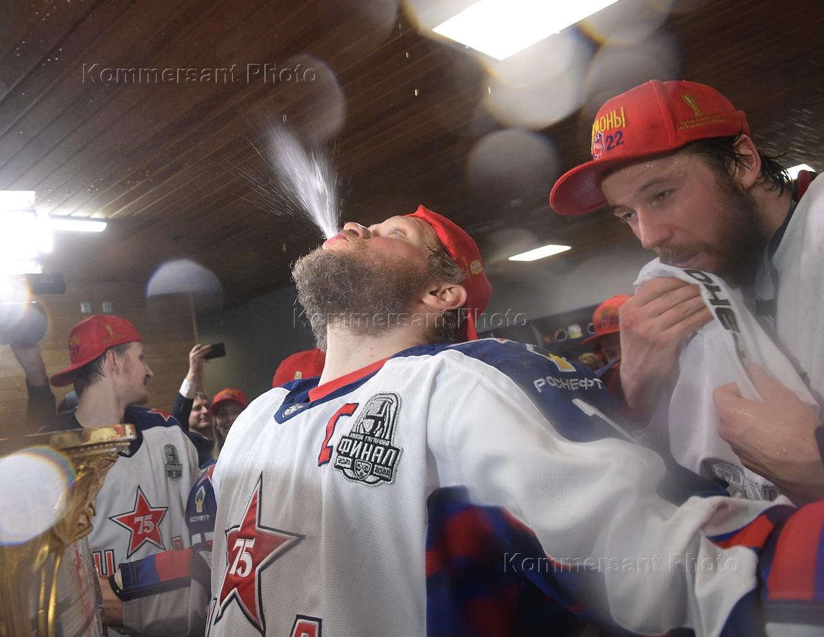 Континентальная хоккейная лига (КХЛ). Плей-офф Кубка Гагарина. Финал. 7-й матч. Матч между командами "Металлург Мг" (Магнитогорск) - ЦСКА (Москва) на стадионе "Арена-Металлург". Игроки команды ЦСКА пьют шампанское из Кубка Гагарина после победы команды в матче.