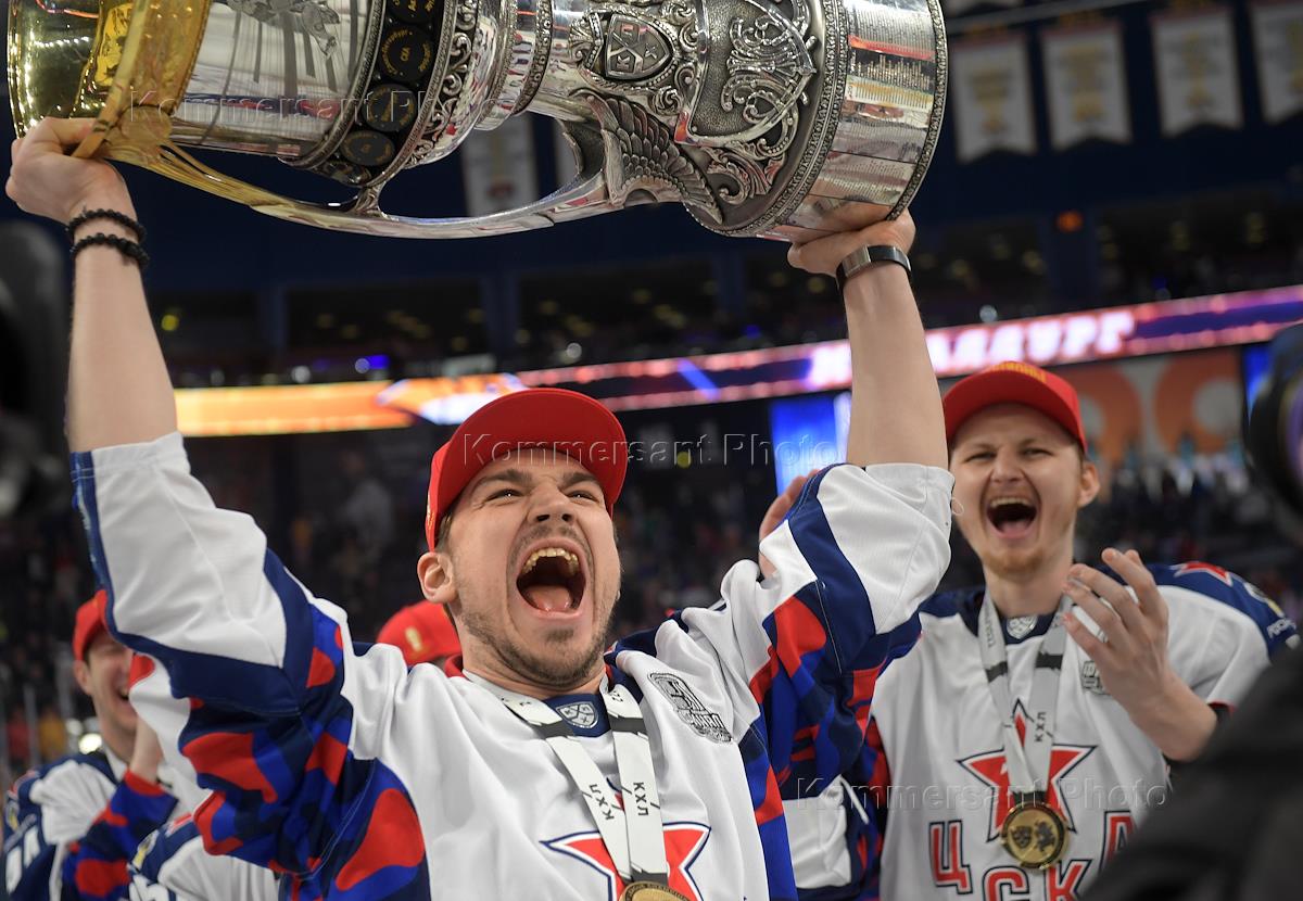 Континентальная хоккейная лига (КХЛ). Плей-офф Кубка Гагарина. Финал. 7-й матч. Матч между командами "Металлург Мг" (Магнитогорск) - ЦСКА (Москва) на стадионе "Арена-Металлург". Игрок команды ЦСКА во время церемонии награждения победителей турнира.