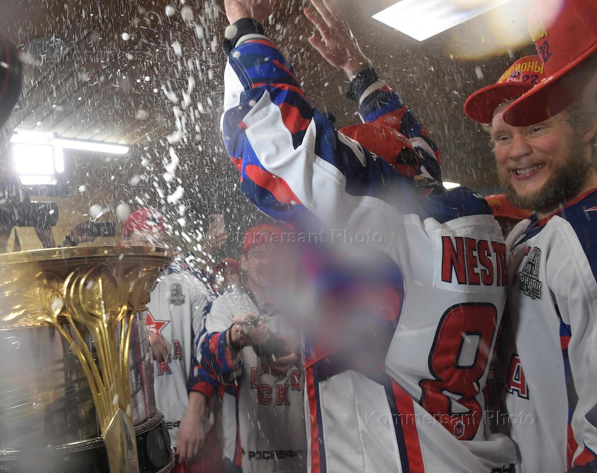 Континентальная хоккейная лига (КХЛ). Плей-офф Кубка Гагарина. Финал. 7-й матч. Матч между командами "Металлург Мг" (Магнитогорск) - ЦСКА (Москва) на стадионе "Арена-Металлург". Игрок команды ЦСКА во время церемонии награждения победителей турнира.