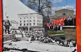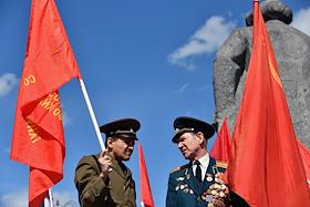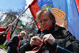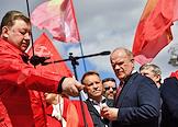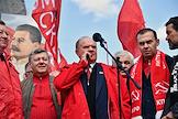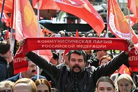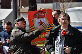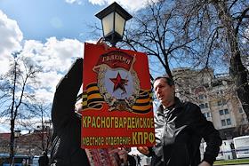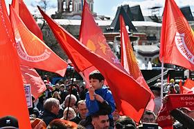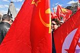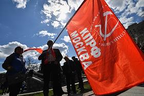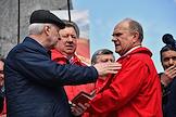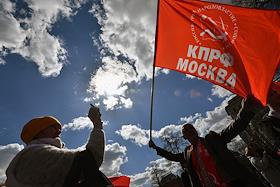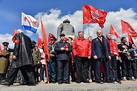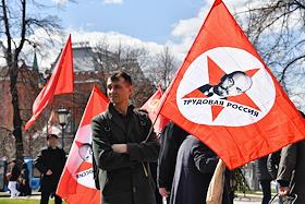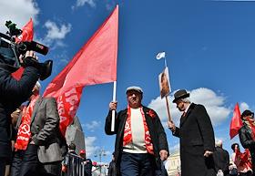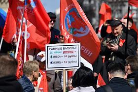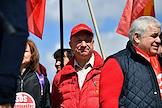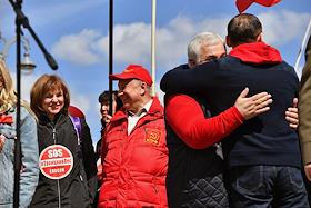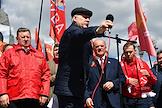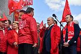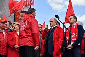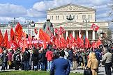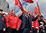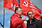 Митинг КПРФ, посвящённый Дню международной солидарности трудящихся, в сквере возле памятника Карлу Марксу на Театральной площади. Член комитета Государственной думы (ГД) России по делам Содружества Независимых Государств, евразийской интеграции и связям с соотечественниками Казбек Тайсаев (справа) и первый заместитель председателя комитета ГД России по делам национальностей Валерий Рашкин (в центре) на митинге.