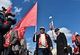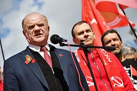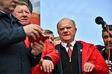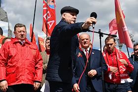 Митинг КПРФ, посвящённый Дню международной солидарности трудящихся, в сквере возле памятника Карлу Марксу на Театральной площади. Председатель комитета Государственной думы (ГД) России по аграрным вопросам Владимир Кашин (слева) и лидер КПРФ, член комитета ГД России по делам Содружества Независимых Государств, евразийской интеграции и связям с соотечественниками Геннадий Зюганов (справа) на митинге.