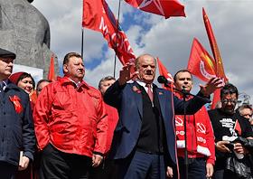 Митинг КПРФ, посвящённый Дню международной солидарности трудящихся, в сквере возле памятника Карлу Марксу на Театральной площади. Слева направо: лидер КПРФ, член комитета Государственной думы (ГД) России по делам Содружества Независимых Государств, евразийской интеграции и связям с соотечественниками Геннадий Зюганов, первый заместитель комитета ГД России по безопасности и противодействию коррупции Юрий Афонин и первый заместитель председателя комитета ГД России по информационной политике, информационным технологиям и связи Александр Ющенко на митинге.