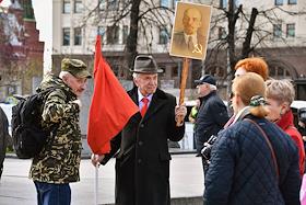 Митинг КПРФ, посвящённый Дню международной солидарности трудящихся, в сквере возле памятника Карлу Марксу на Театральной площади. Участники на митинге.