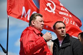 Митинг КПРФ, посвящённый Дню международной солидарности трудящихся, в сквере возле памятника Карлу Марксу на Театральной площади. Председатель комитета Государственной думы России по аграрным вопросам Владимир Кашин (слева) на митинге.
