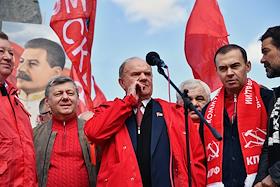 Митинг КПРФ, посвящённый Дню международной солидарности трудящихся, в сквере возле памятника Карлу Марксу на Театральной площади. Председатель комитета Государственной думы (ГД) России по аграрным вопросам Владимир Кашин, руководитель фракции КПРФ в Московской городской думе Николай Зубрилин, лидер КПРФ, член комитета ГД России по делам Содружества Независимых Государств, евразийской интеграции и связям с соотечественниками Геннадий Зюганов и первый заместитель комитета ГД России по безопасности и противодействию коррупции Юрий Афонин на митинге.