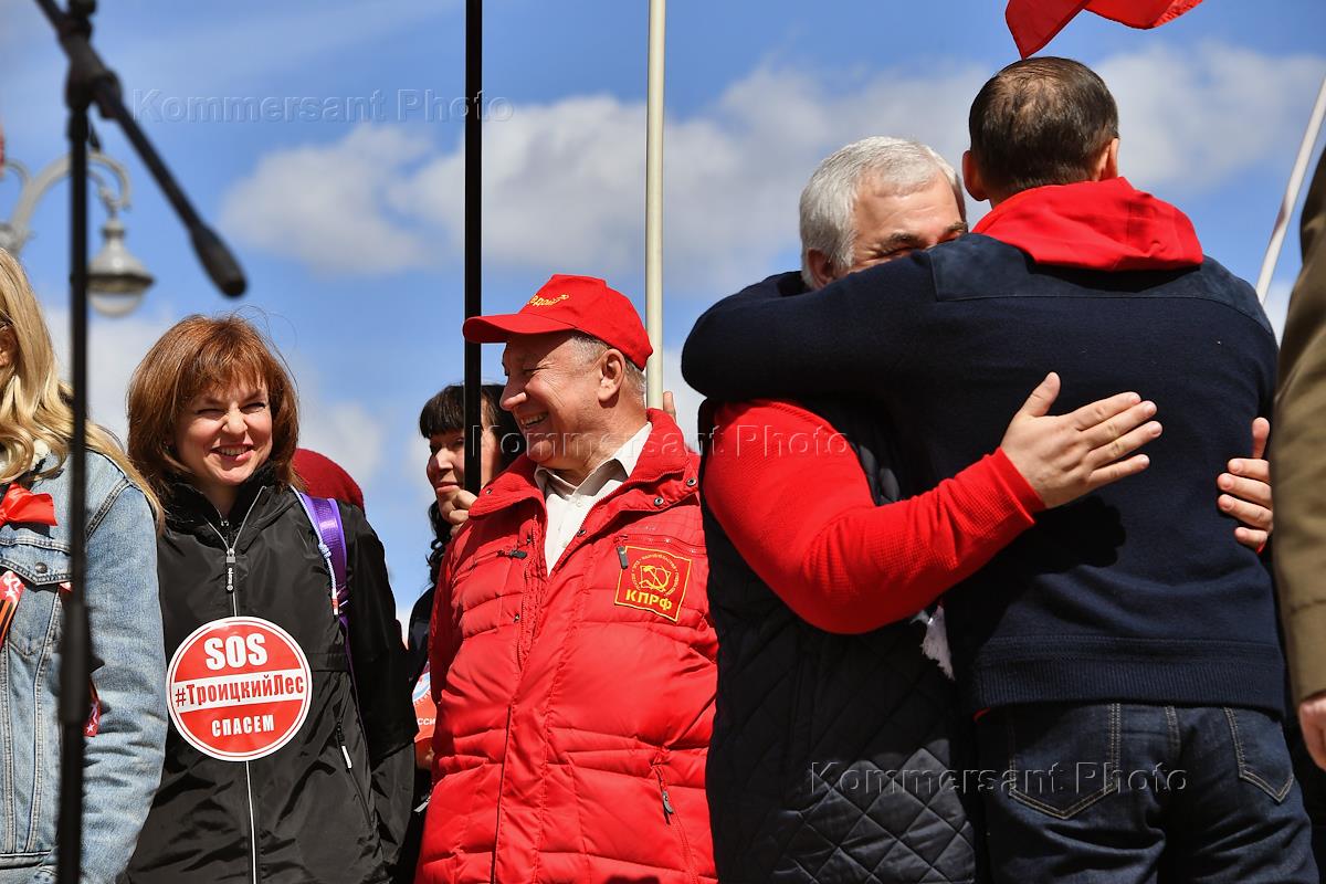 Митинг КПРФ, посвящённый Дню международной солидарности трудящихся, в сквере возле памятника Карлу Марксу на Театральной площади. Член комитета Государственной думы (ГД) России по делам Содружества Независимых Государств, евразийской интеграции и связям с соотечественниками Казбек Тайсаев (справа) и первый заместитель председателя комитета ГД России по делам национальностей Валерий Рашкин (в центре) на митинге.