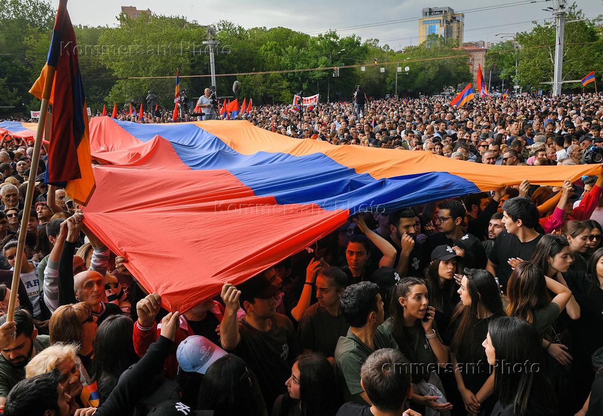 Объединенный митинг оппозиции на площади Франции. Протестующие разбили палаточный лагерь для ночевки. С 17 апреля 2022 года оппозиция проводит в Армении акции протеста, заявляя, что политика действующих властей угрожает государственности и безопасности Армении и Арцаха.