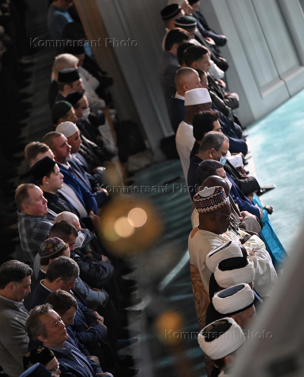 Festive events on the day of Uraza Bayram in the Moscow Cathedral Mosque. Believers at worship in the mosque.