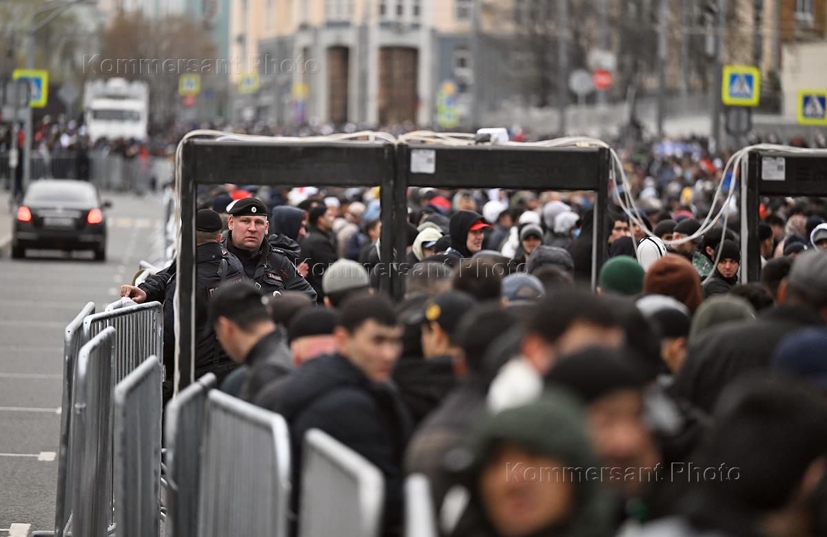 Festive events on the day of Uraza Bayram in the Moscow Cathedral Mosque. Believers during the passage of worship in the square near the mosque.