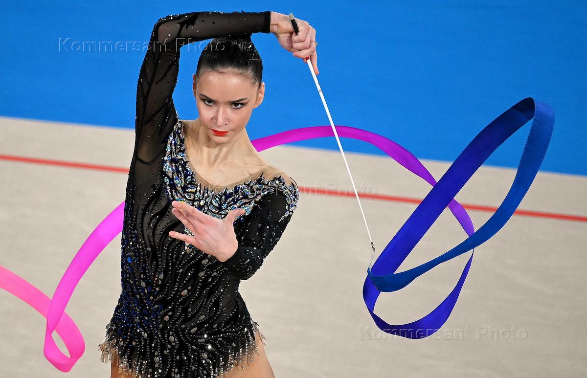 Международный турнир по художественной гимнастики в Центре Гимнастики Ирины Винер-Усмановой. Личное многоборье. Российская гимнастка Лала Крамаренко во время выступления с лентой.