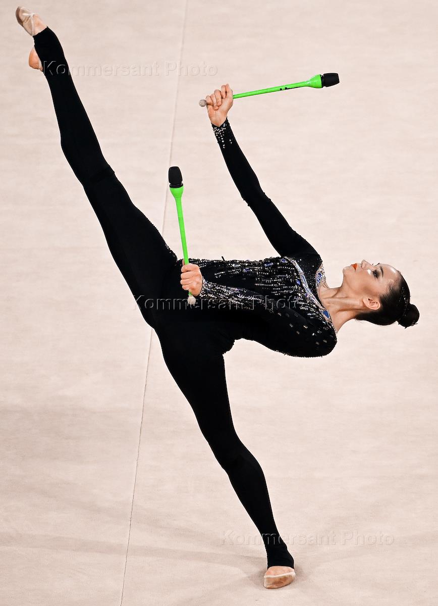 Международный турнир по художественной гимнастики в Центре Гимнастики Ирины Винер-Усмановой. Личное многоборье. Российская гимнастка Лала Крамаренко во время выступления с булавами.