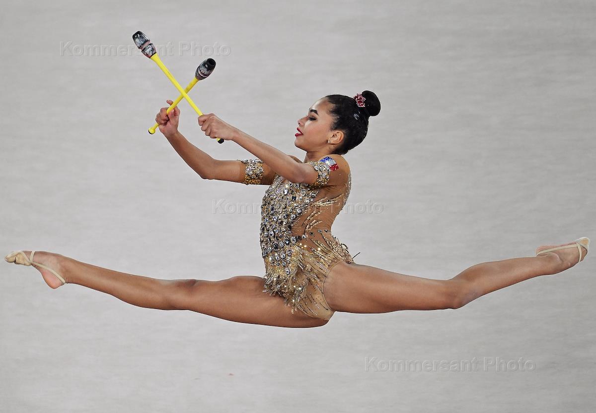 Международный турнир по художественной гимнастики в Центре Гимнастики Ирины Винер-Усмановой. Личное многоборье. Российская гимнастка Софья Копылова во время упражнения с булавами.