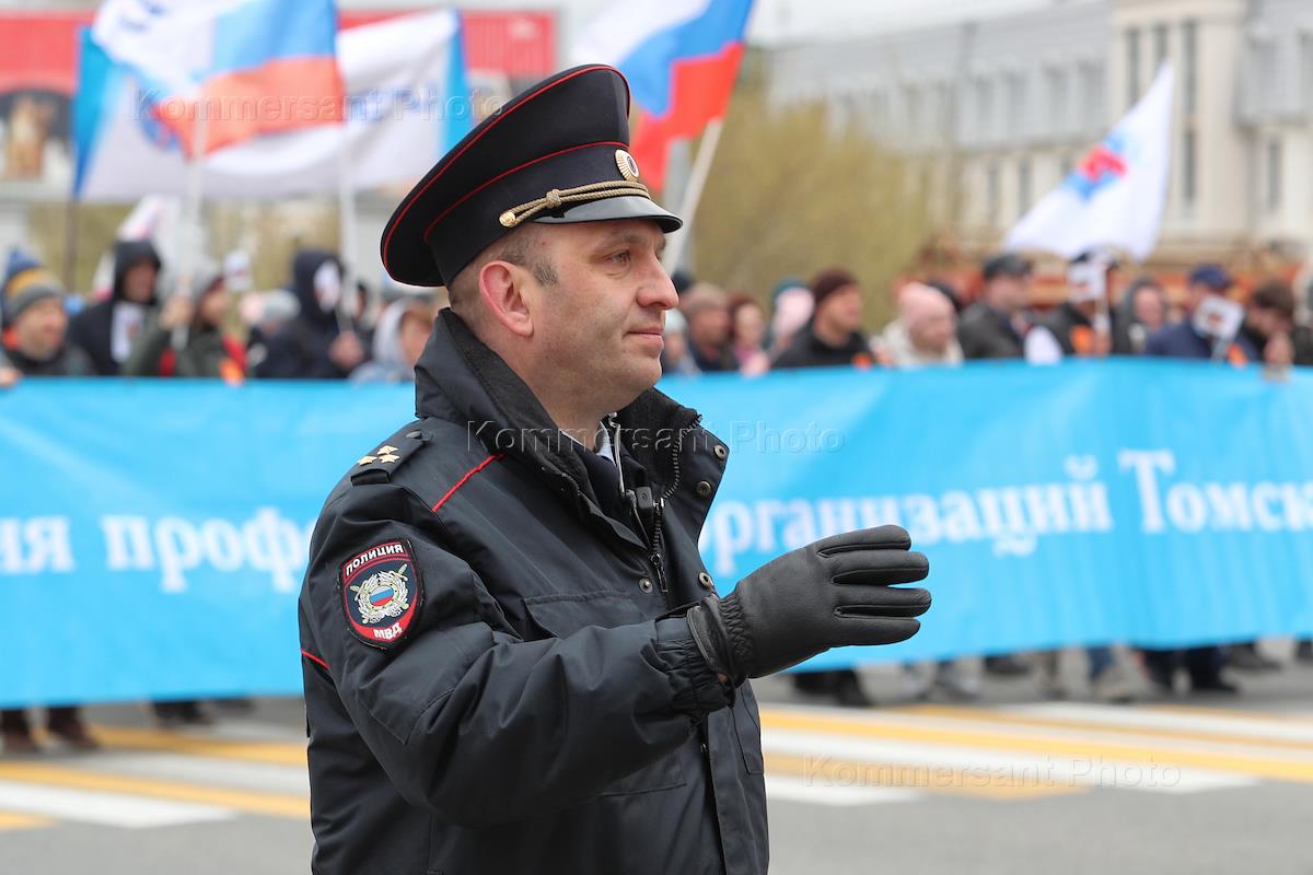 Всероссийская акция, посвященная Дню международной солидарности трудящихся. Участники во время Первомайского шествия по проспекту Ленина до Новособорной площади.