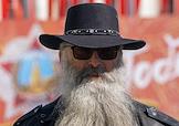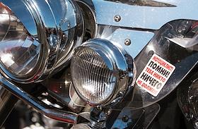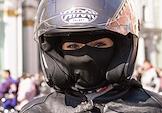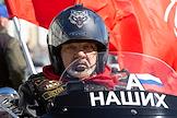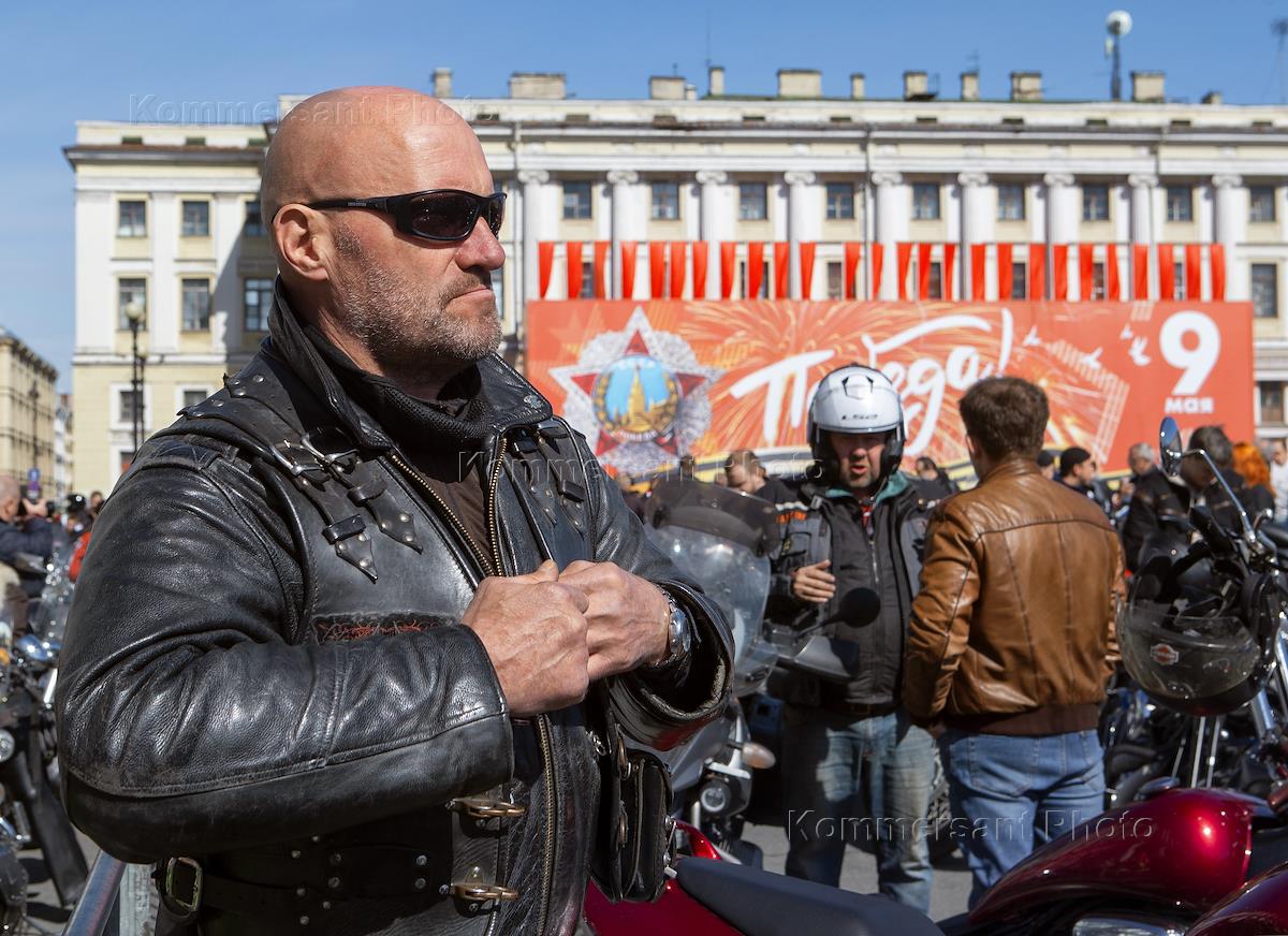 Мотоциклетный парад в честь открытия мотосезона на Дворцовой площади. Участник перед началом мотопарада.
